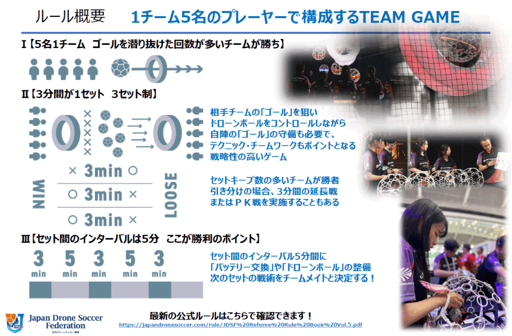 ドローンサッカー®は、お子様からご高齢者まで年齢や性別を問わずに、「チームで戦術を練り」、「それぞれが自分の役割を担い」、「周囲の動きを見ながら考えドローンを操縦など」、楽しみを共有できるバリアフリーな競技です。また、競技を通じてセンサーレスのドローンボール操縦に習熟することで、ドローンの操縦技術の向上とともに、 家族や企業、学生のサークル、地域のコミュニティなどでの、チームプレイの楽しさとチームワークやコミュニケーションの醸成にも貢献できるものと考えています。